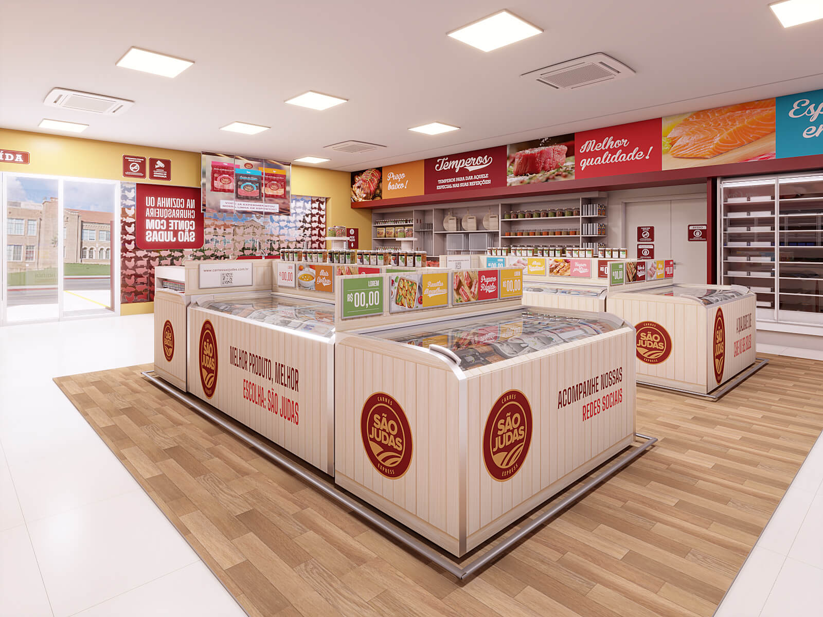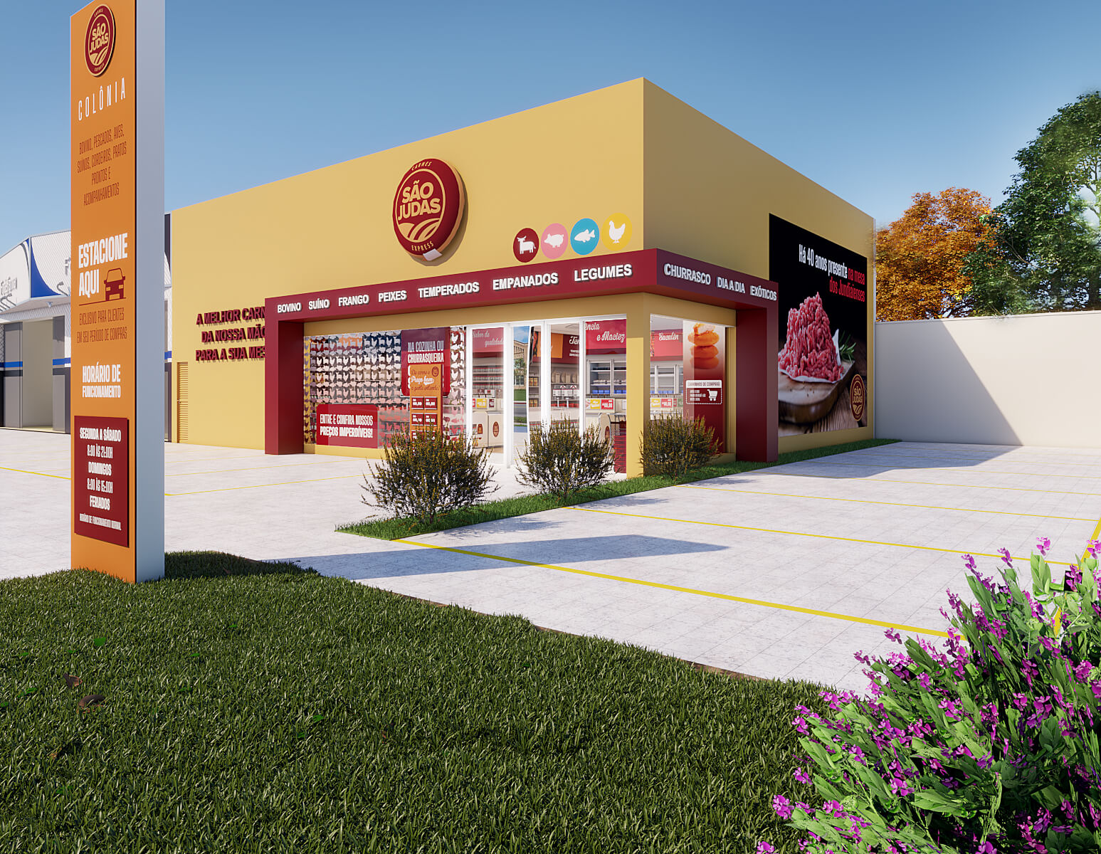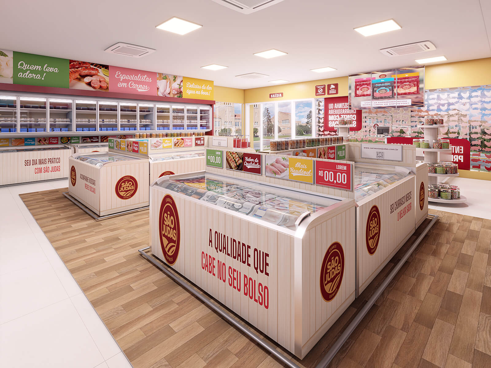 O açougue Carnes São Judas buscou uma arquitetura de qualidade, estratégica e que faria o estabelecimento se comunicar melhor com os clientes para vender mais. Para isso foi utilizado como estratégia a comunicação visual e um sistema de cartazeamento eficiente que permite que o PDV esteja sempre atualizado e completo.