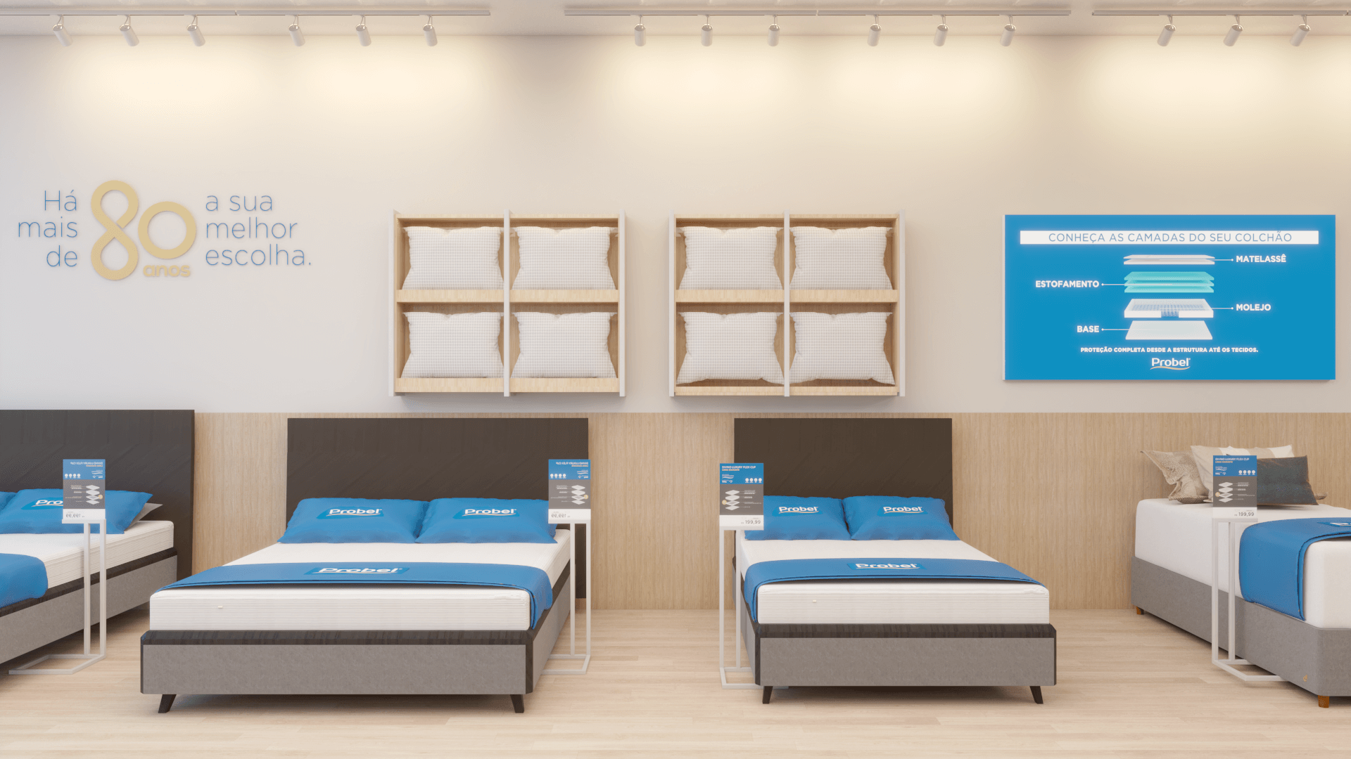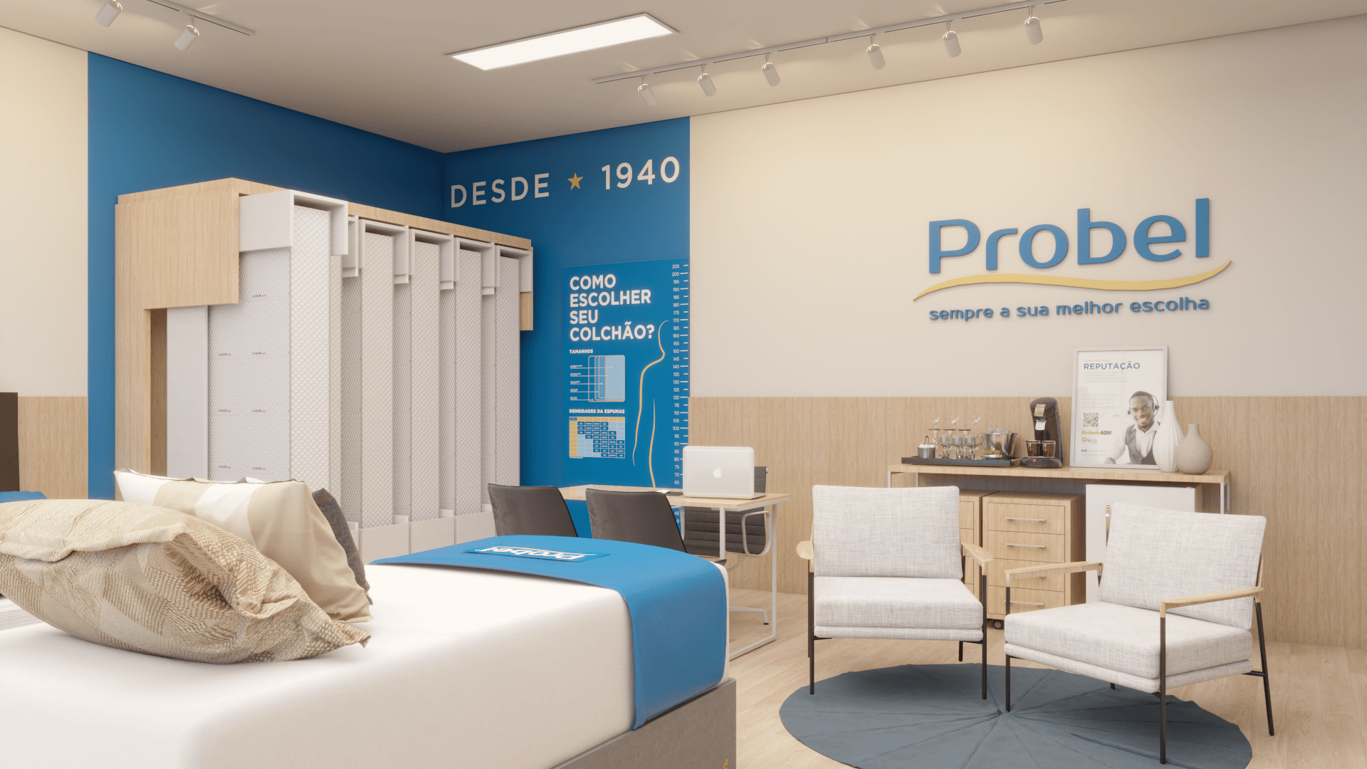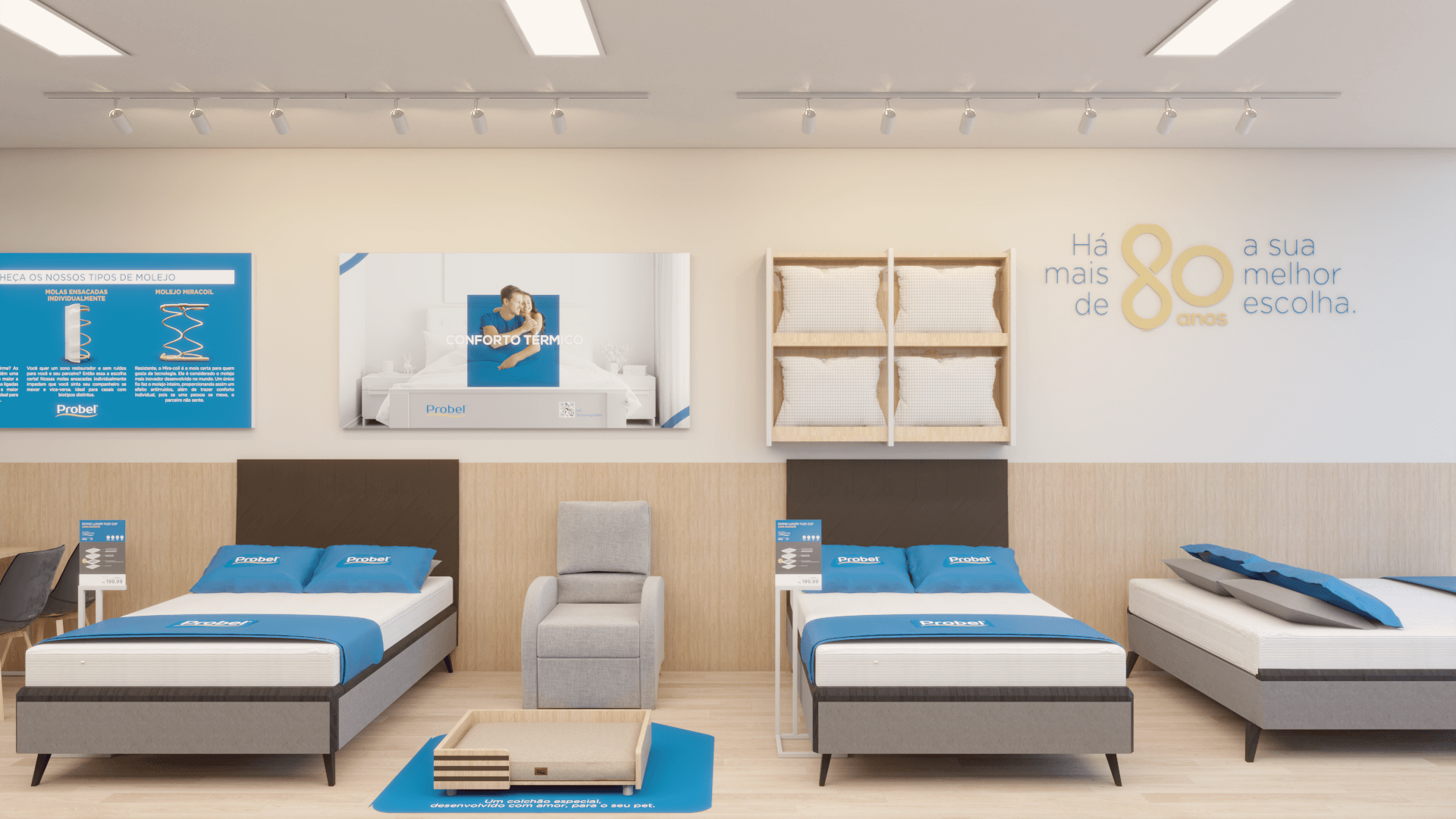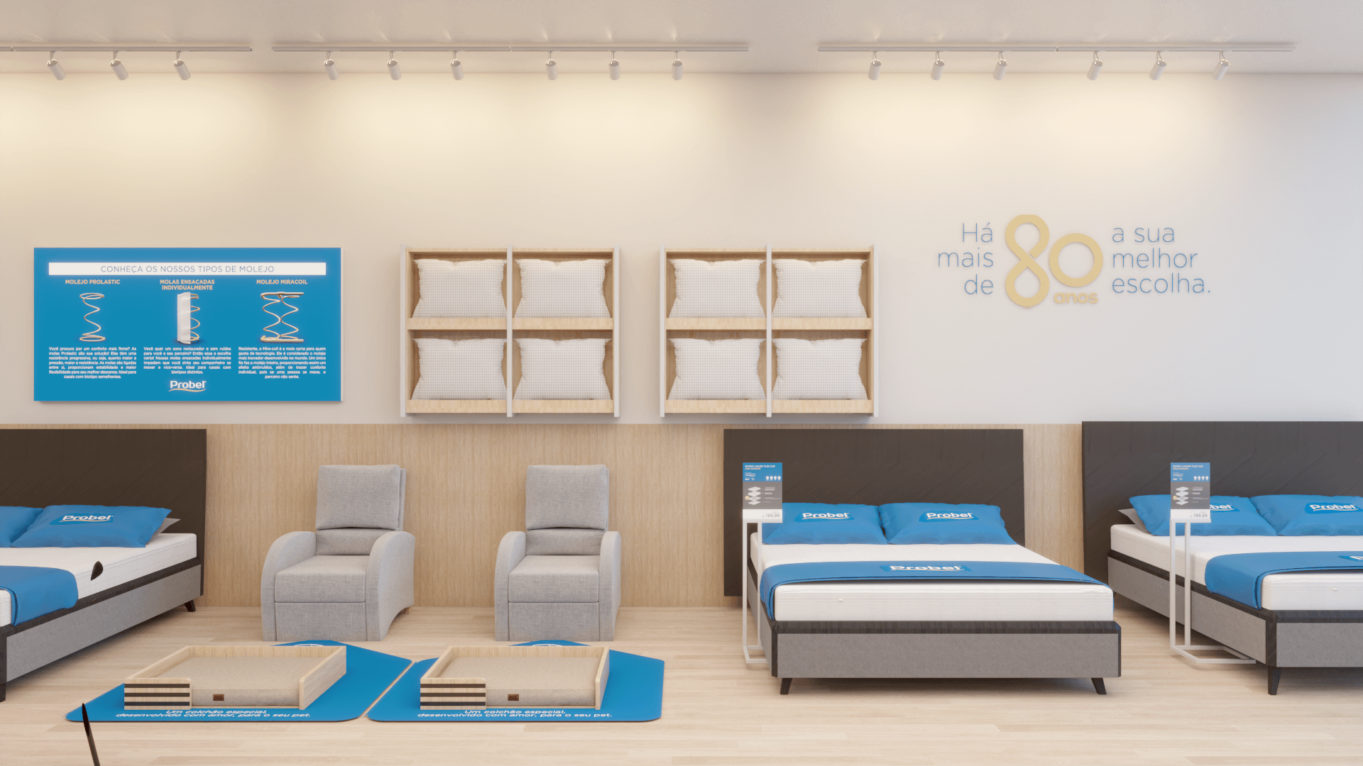 A Probel Colchões está há mais de 90 anos no mercado e é referência em seu segmento. Com mais de 200 lojas inauguradas, a Probel escolheu a Goakira Design para desenvolver seu novo projeto conceito que tem por objetivo padronizar a arquitetura e experiência de compra da marca.