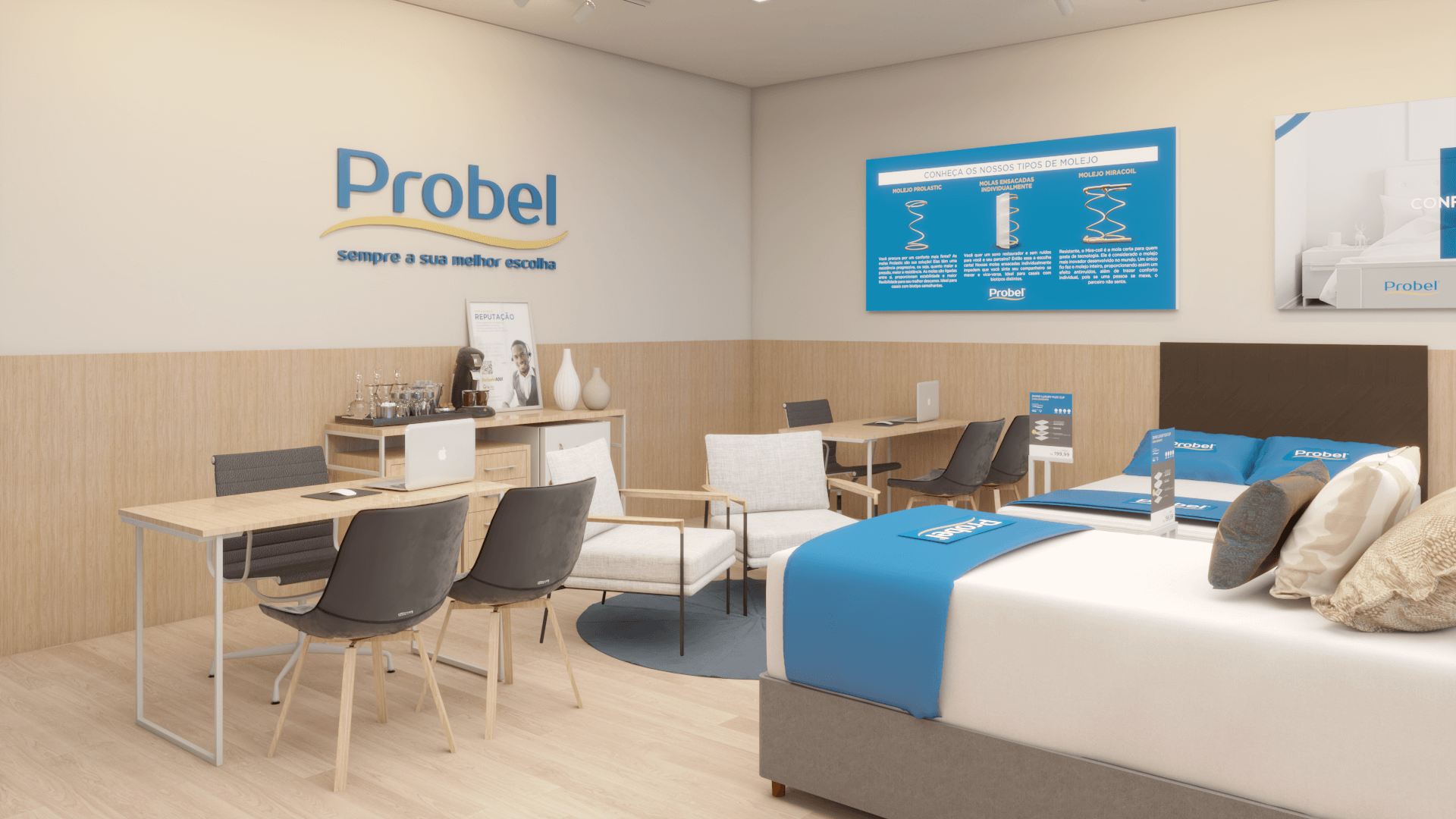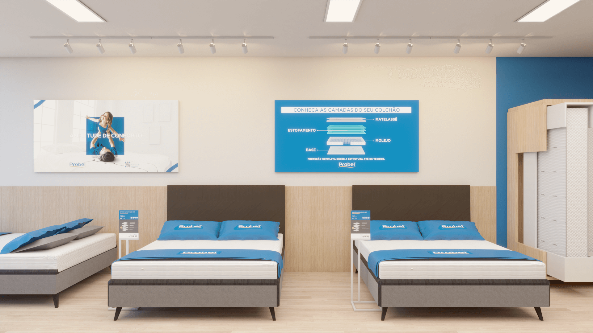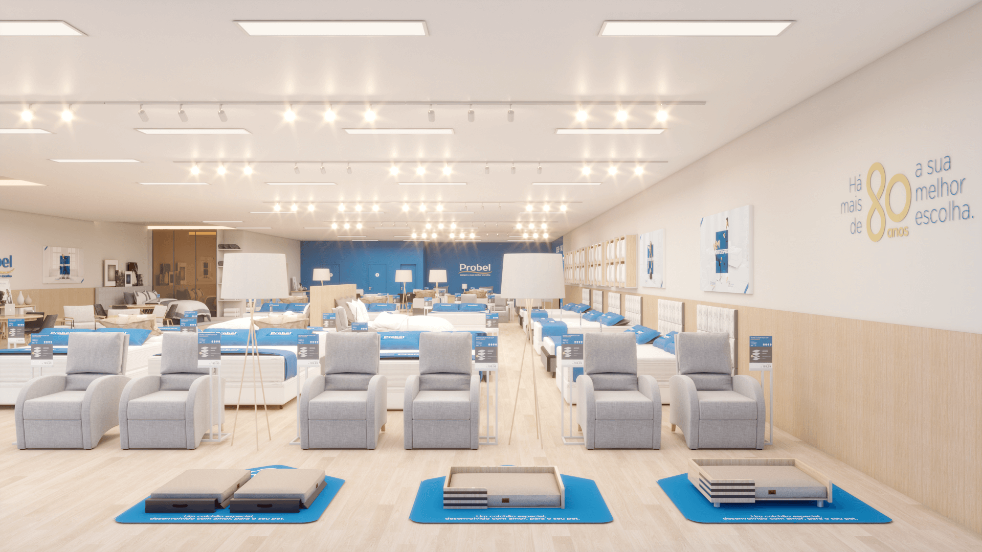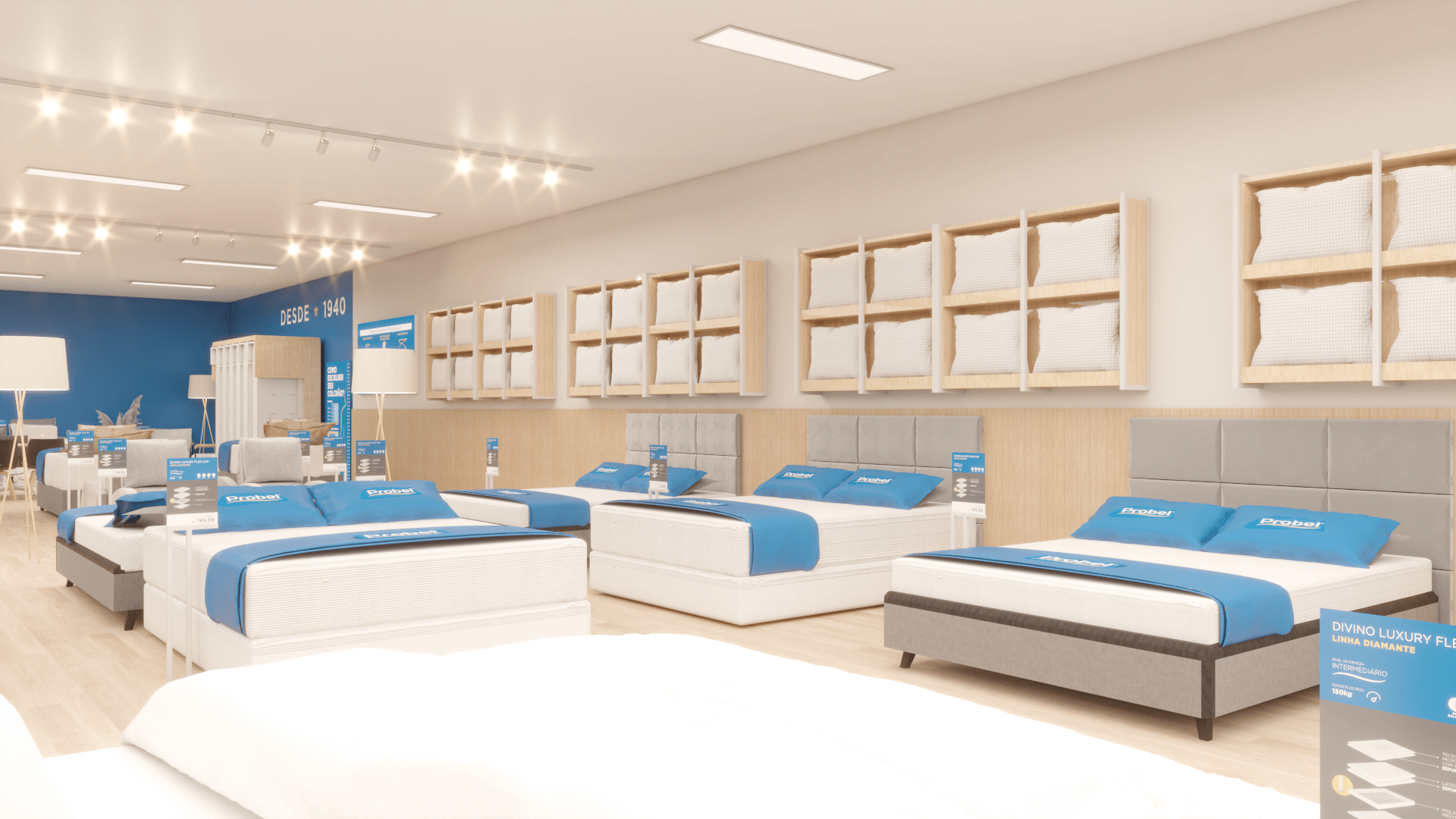 A Probel Colchões está há mais de 90 anos no mercado e é referência em seu segmento. Com mais de 200 lojas inauguradas, a Probel escolheu a Goakira Design para desenvolver seu novo projeto conceito que tem por objetivo padronizar a arquitetura e experiência de compra da marca.