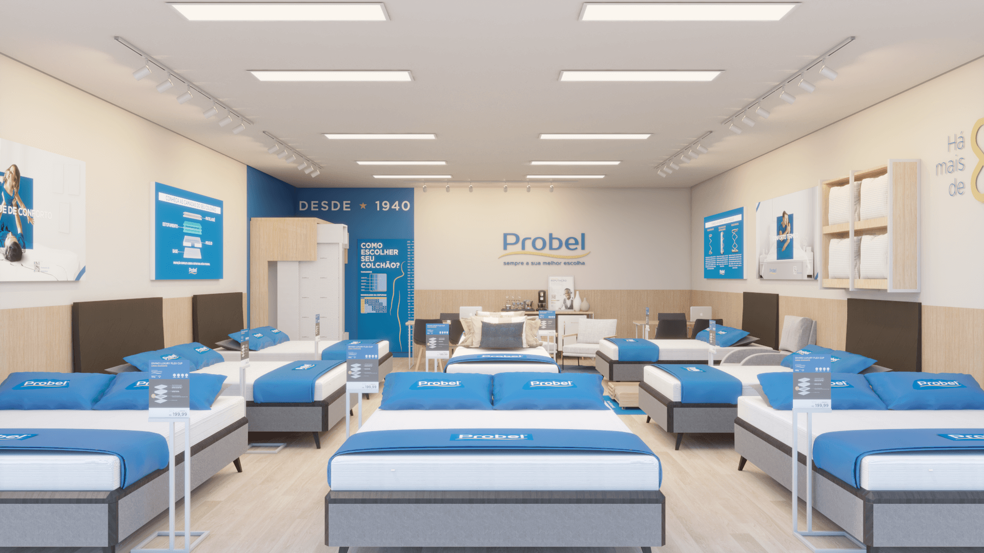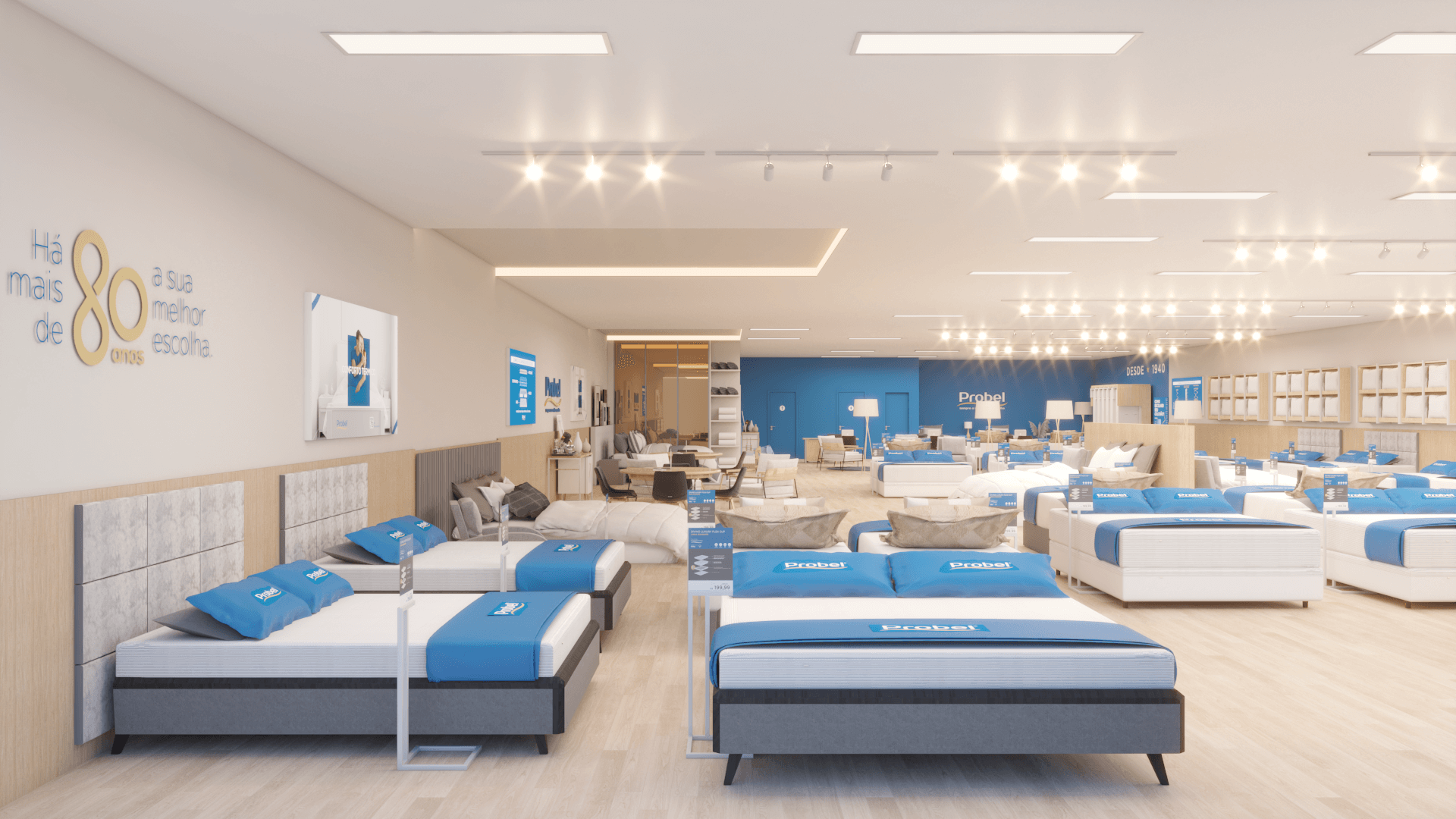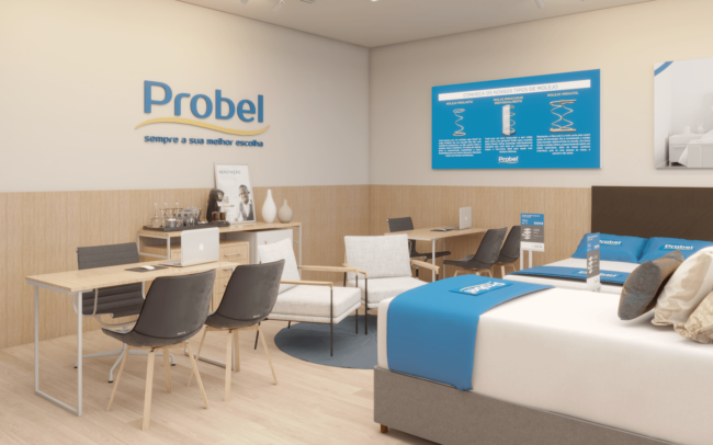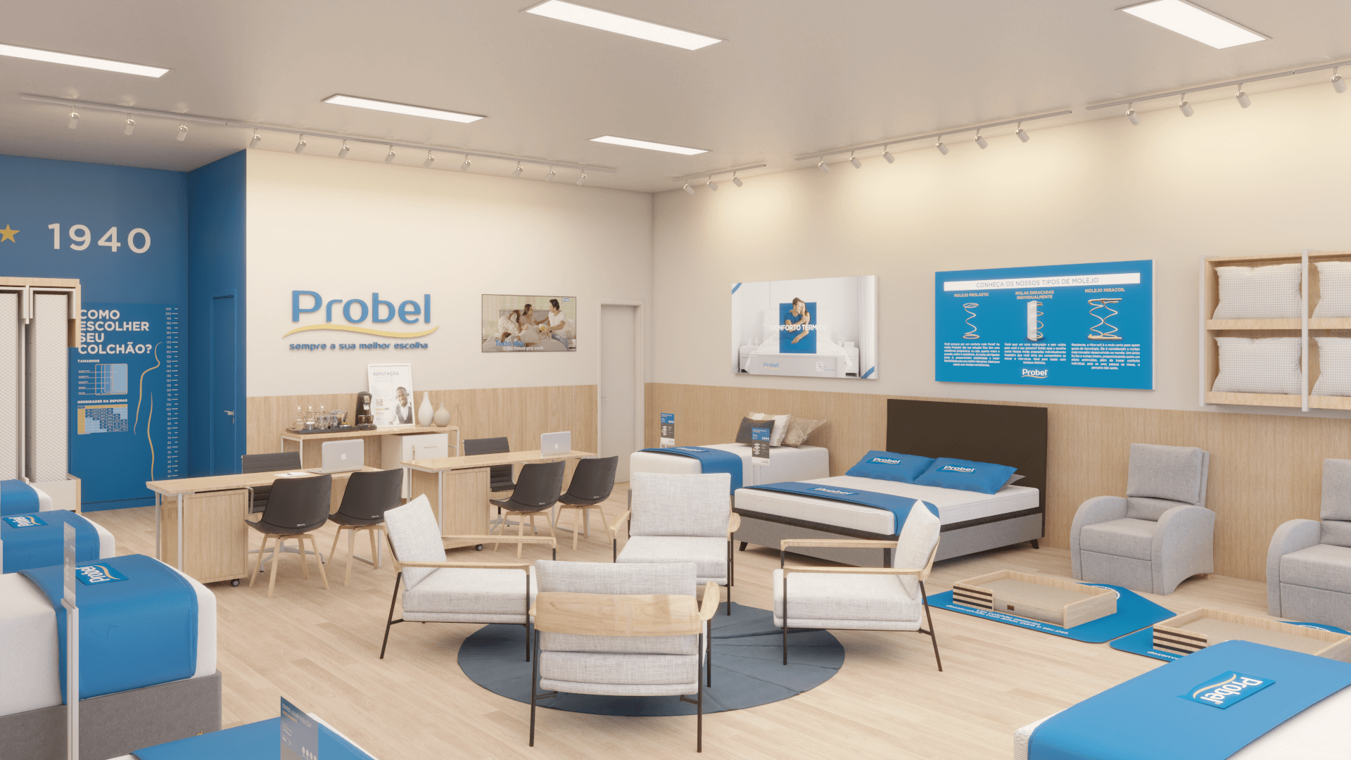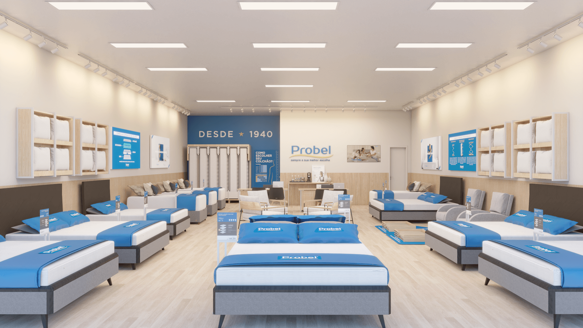 A Probel Colchões está há mais de 90 anos no mercado e é referência em seu segmento. Com mais de 200 lojas inauguradas, a Probel escolheu a Goakira Design para desenvolver seu novo projeto conceito que tem por objetivo padronizar a arquitetura e experiência de compra da marca.
