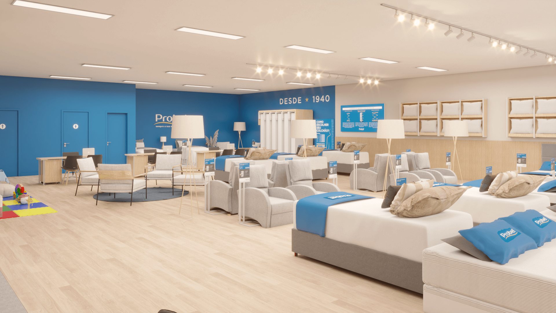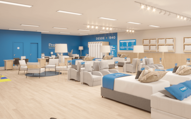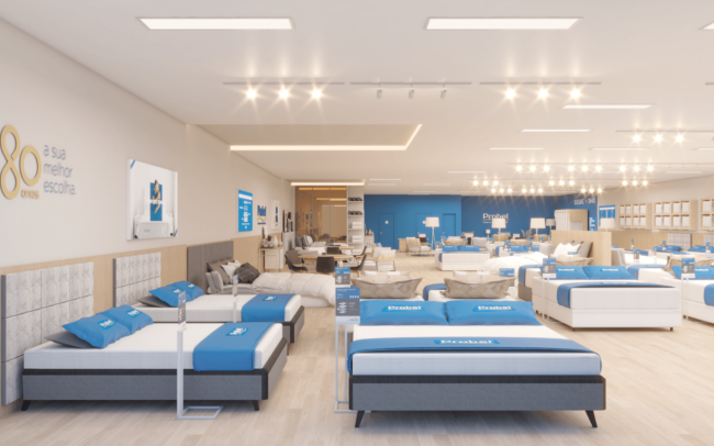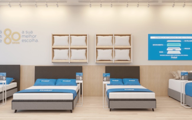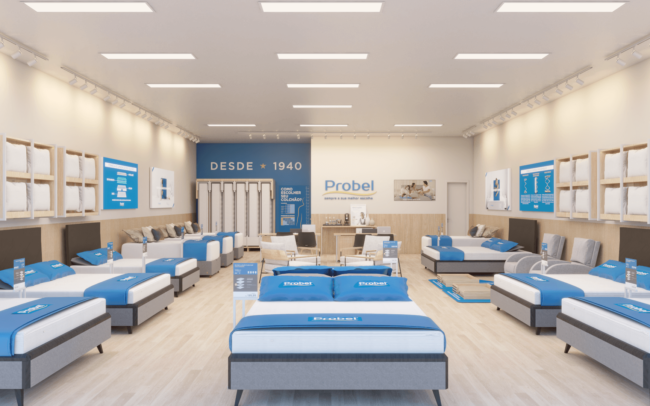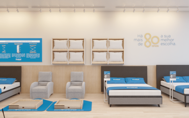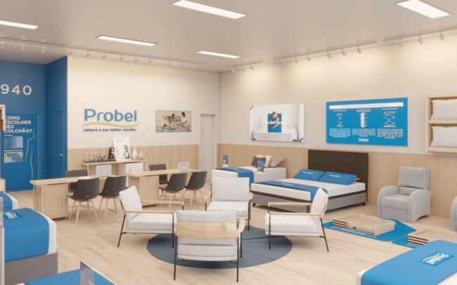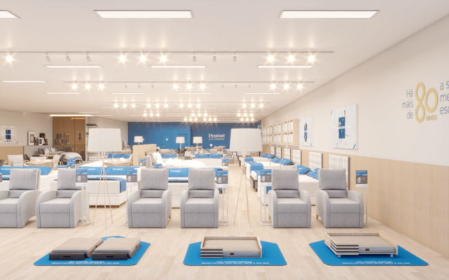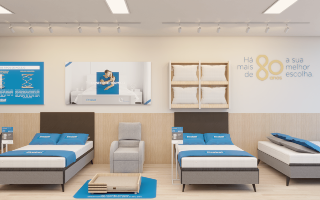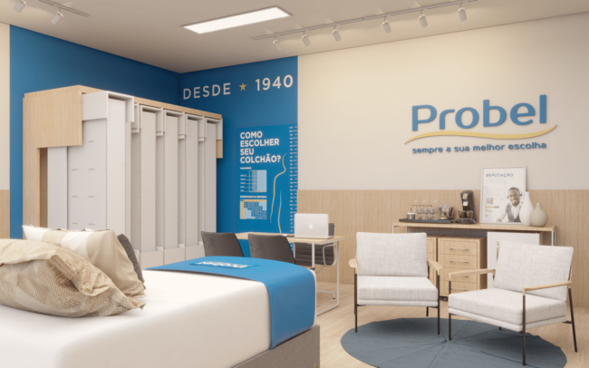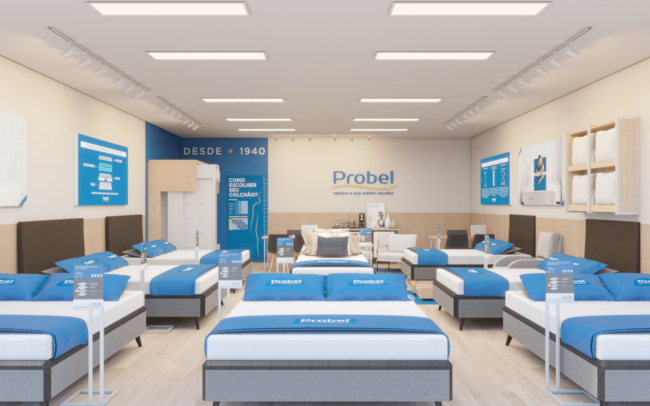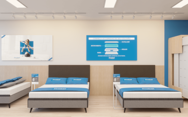 A Probel Colchões está há mais de 90 anos no mercado e é referência em seu segmento. Com mais de 200 lojas inauguradas, a Probel escolheu a Goakira Design para desenvolver seu novo projeto conceito que tem por objetivo padronizar a arquitetura e experiência de compra da marca.