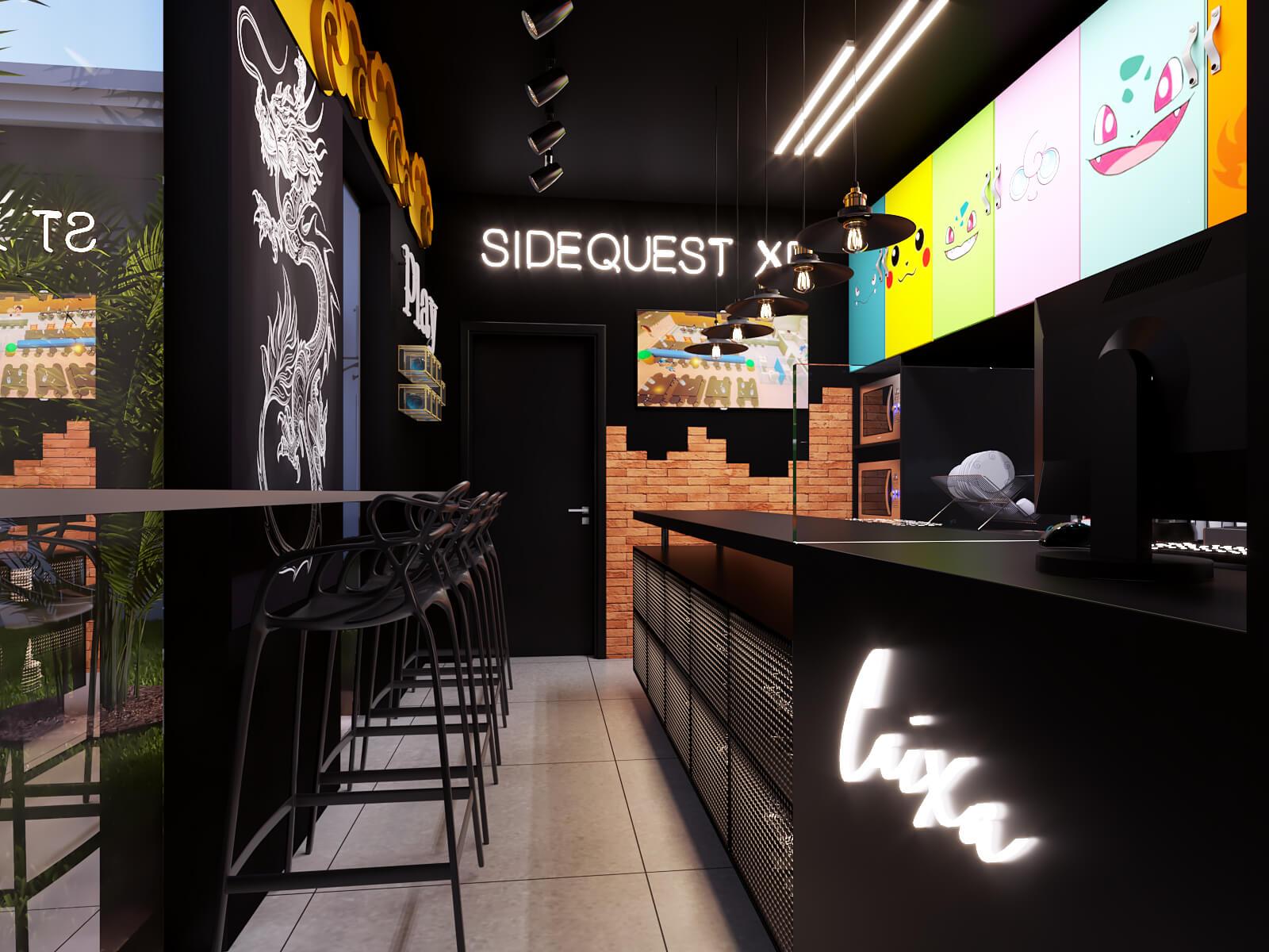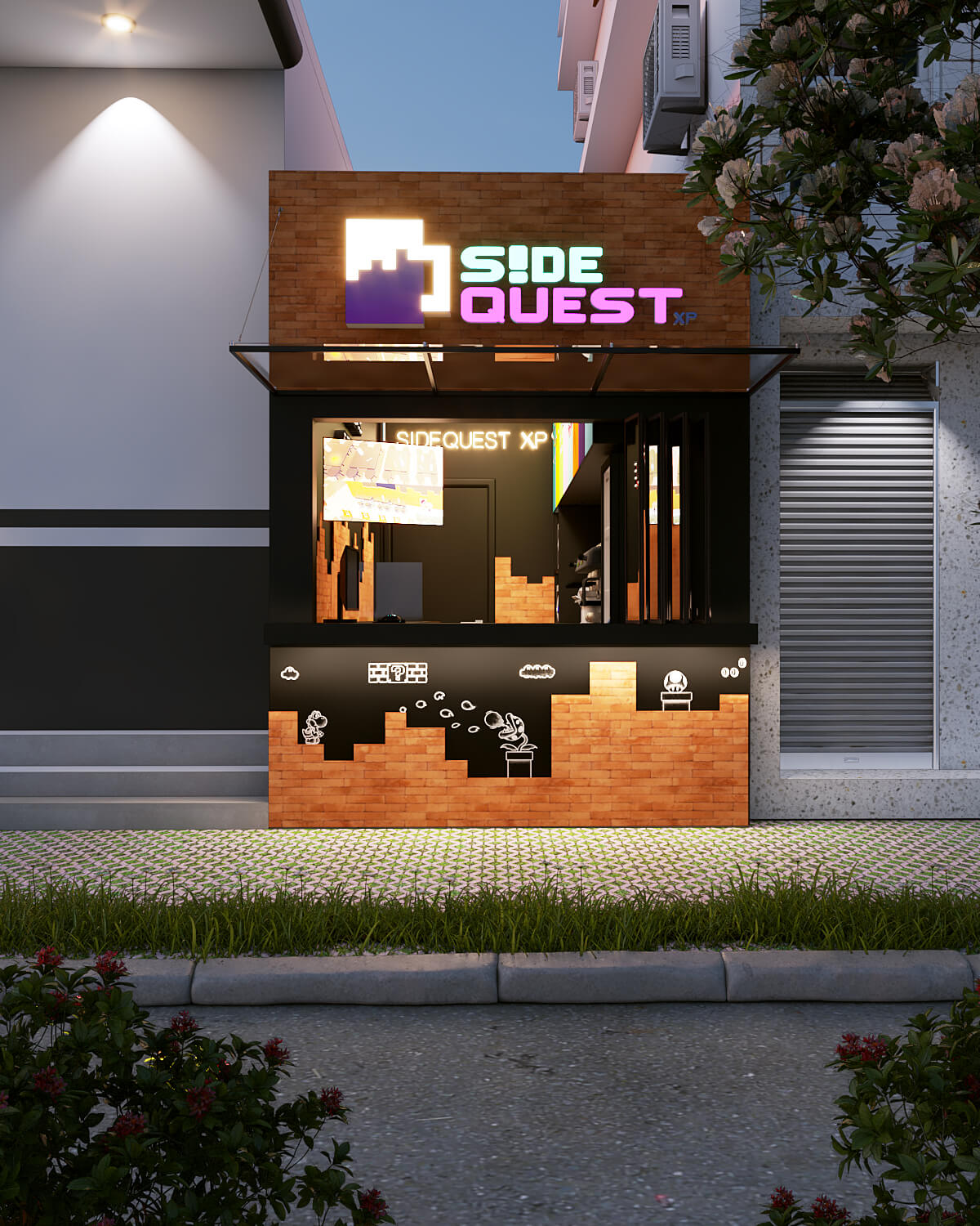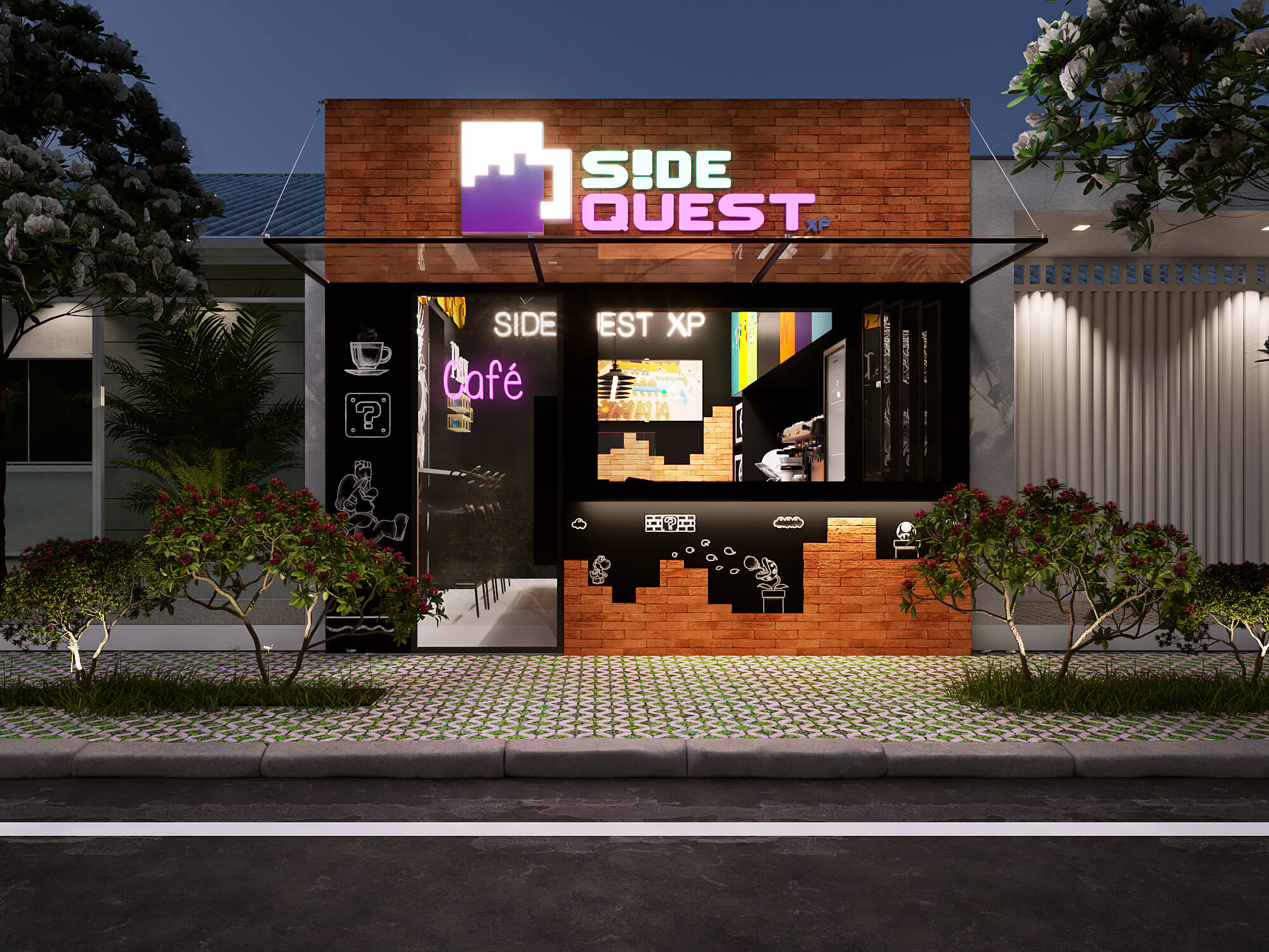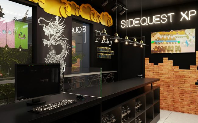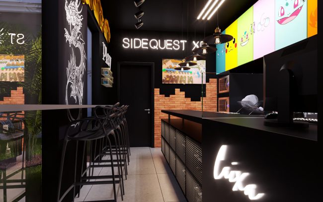 Sidequest XP é uma hamburgueria com temática metaverso. Durante seu processo de formatação de franquias, definiu como modelo de expansão unidades pequenas com muita identidade que oferecem uma experiência arquitetônica que vai além do delivery. Foram utilizados personagens do mundo geek e recursos luminotécnicos no seu conceito arquitetônico.